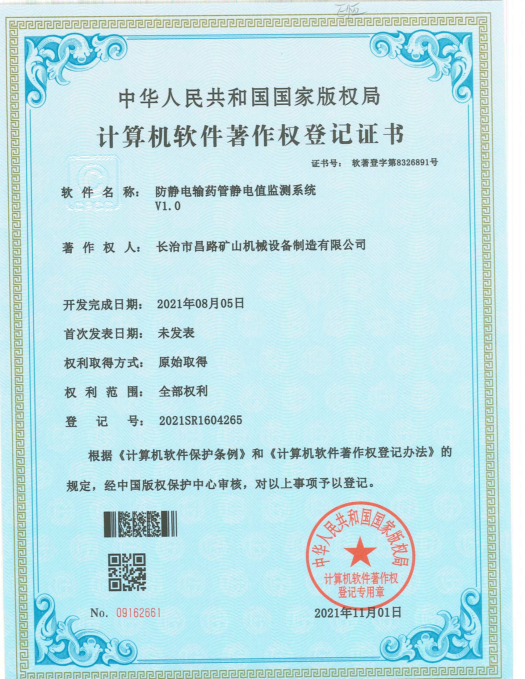 榮獲防靜電輸藥管靜電值監測系統著作權登記證書